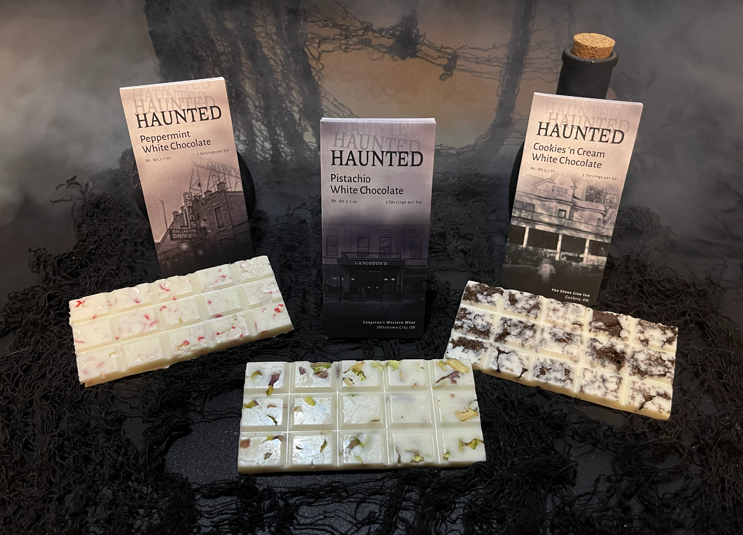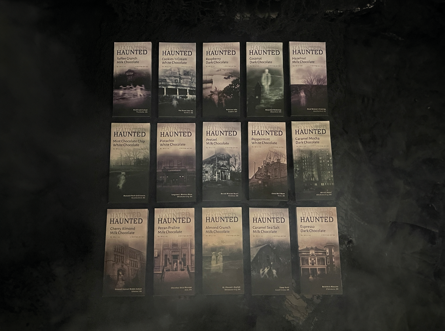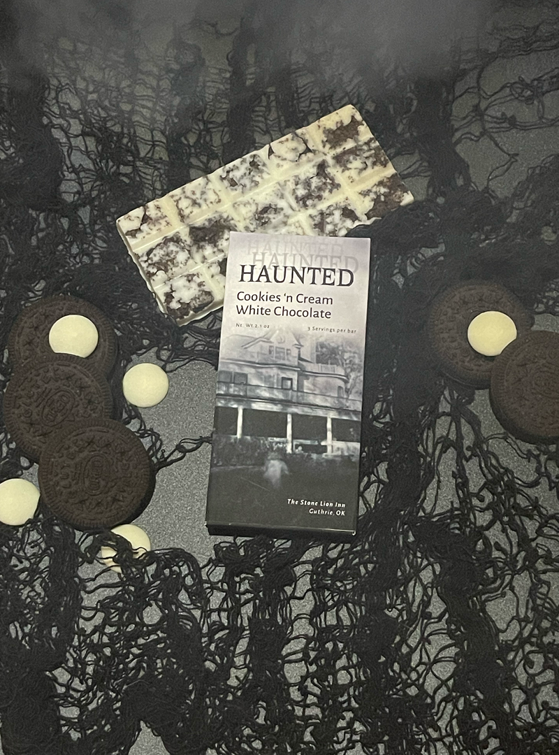 A chocolate brand inspired by haunted places across Oklahoma, offering a thrilling experience of locations like the Skirvin Hotel and Stone Lion Inn.