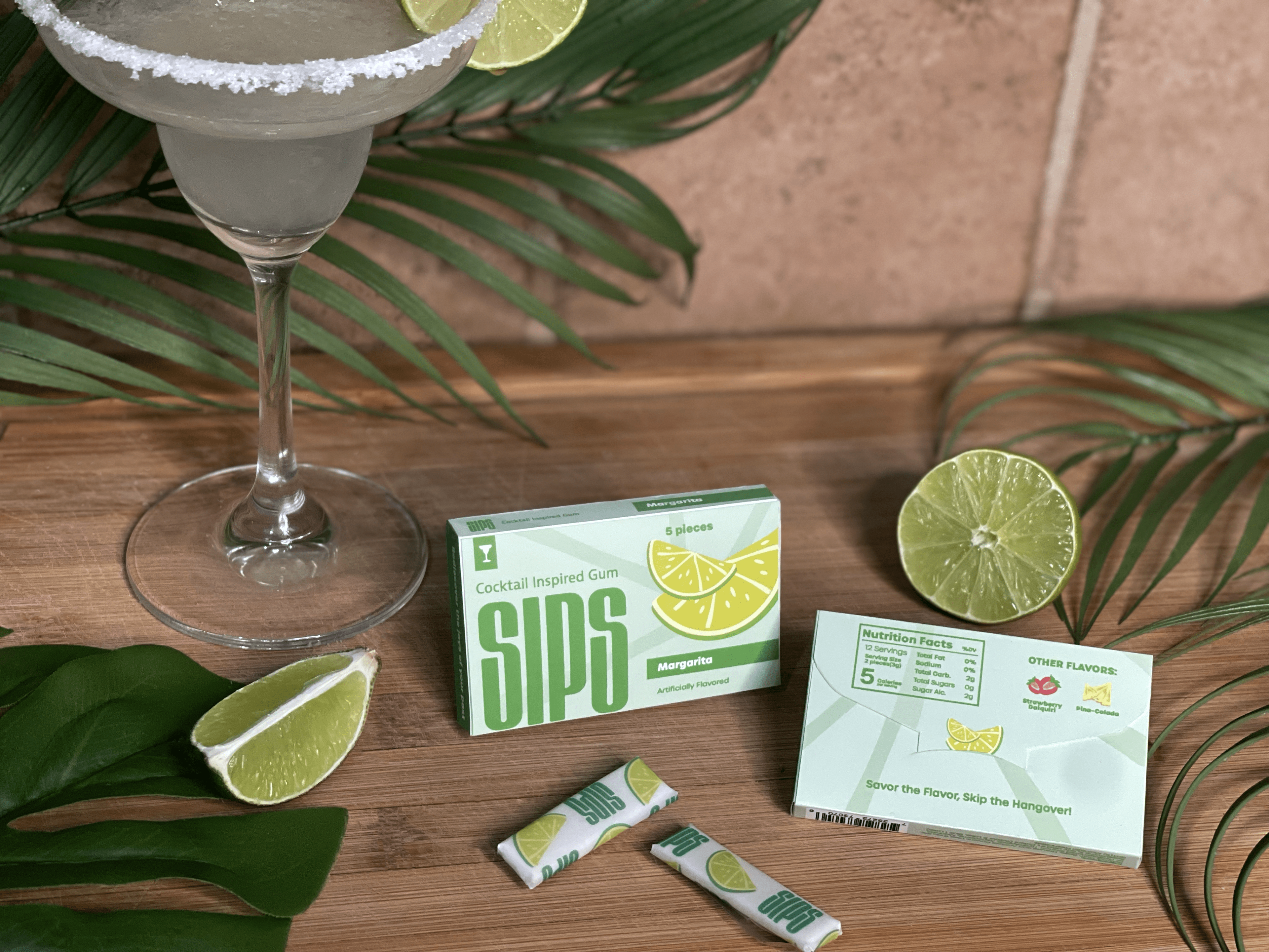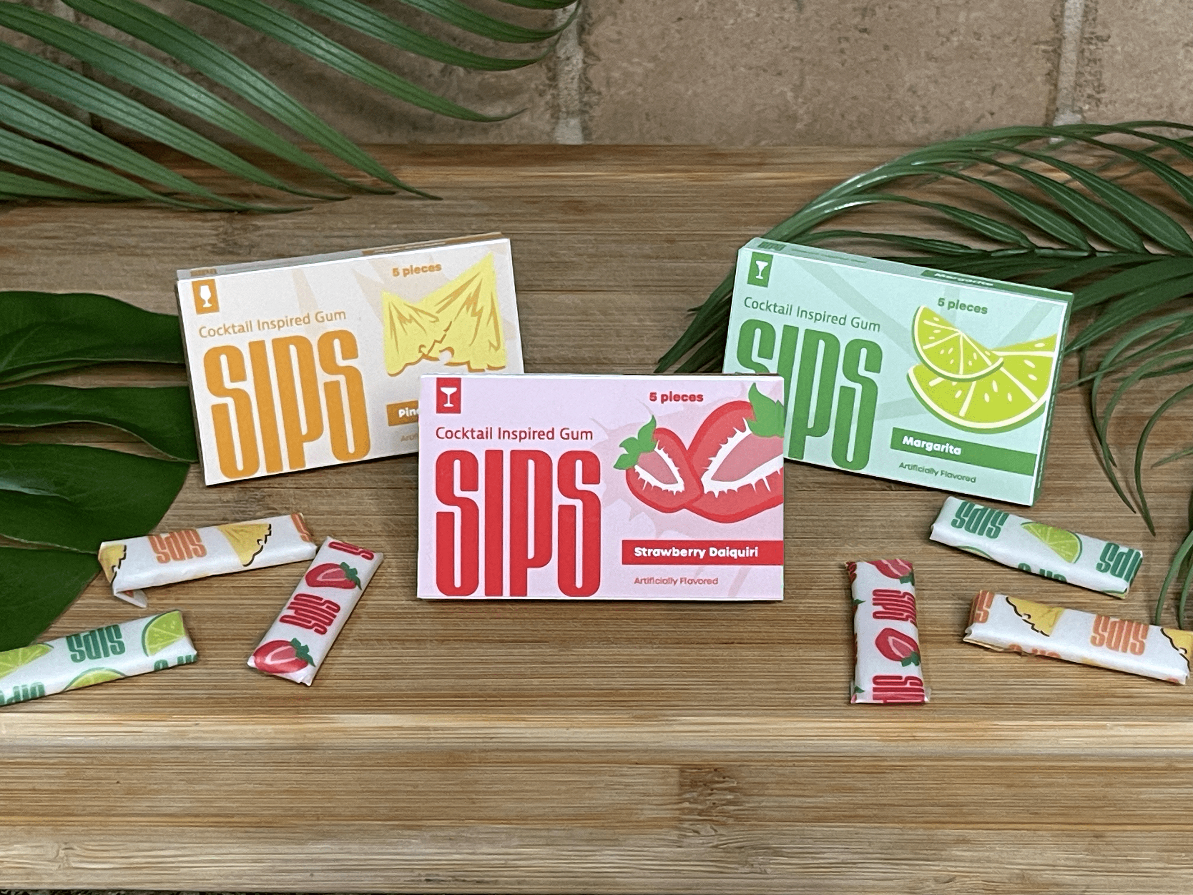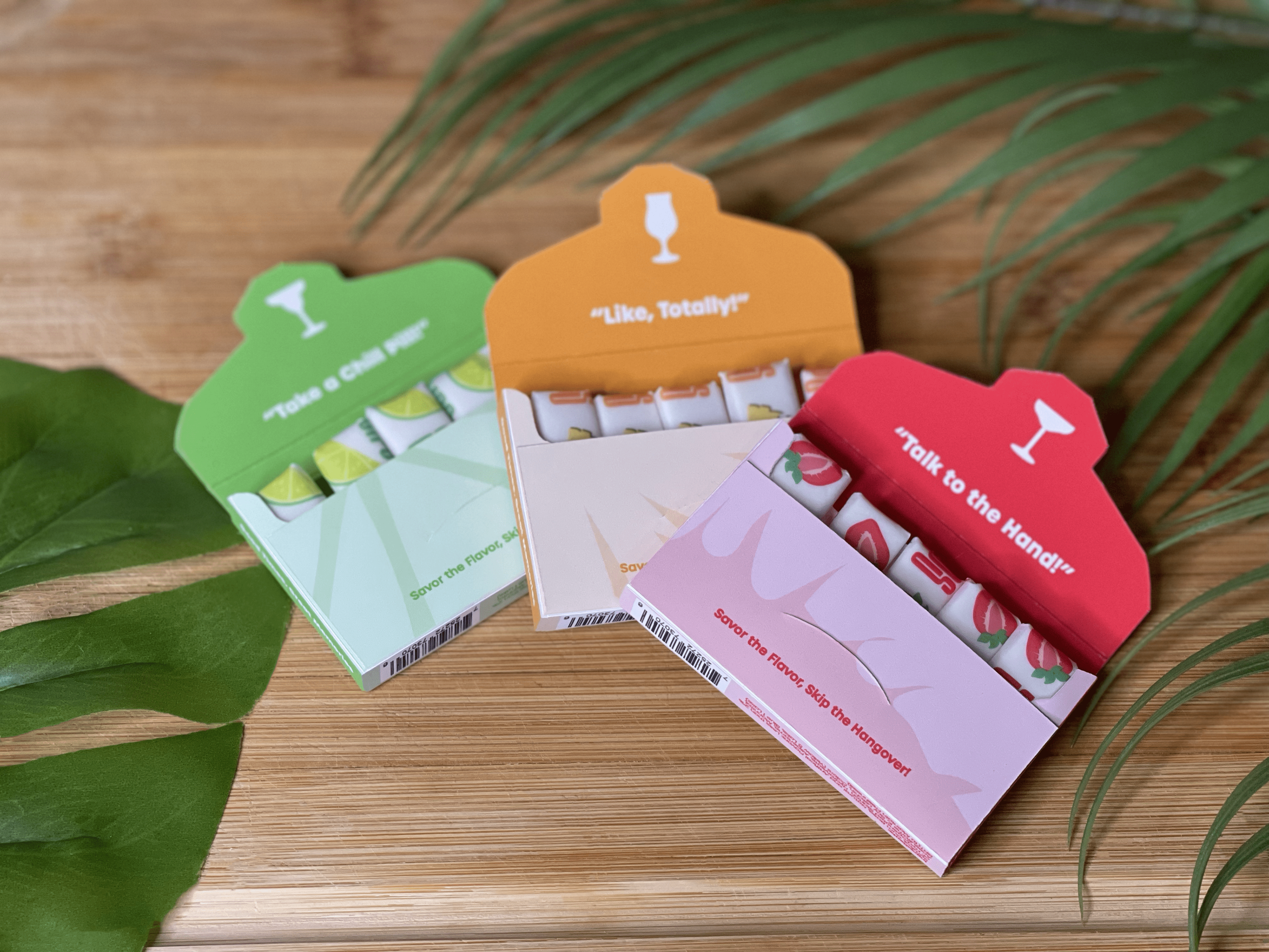 Gum and packaging highlight three virgin mixed drink flavors in chewable form. Inspired by classic cocktails like strawberry daiquiri, margarita, and piƱa~colada, this product offers a refreshing and enjoyable journey.