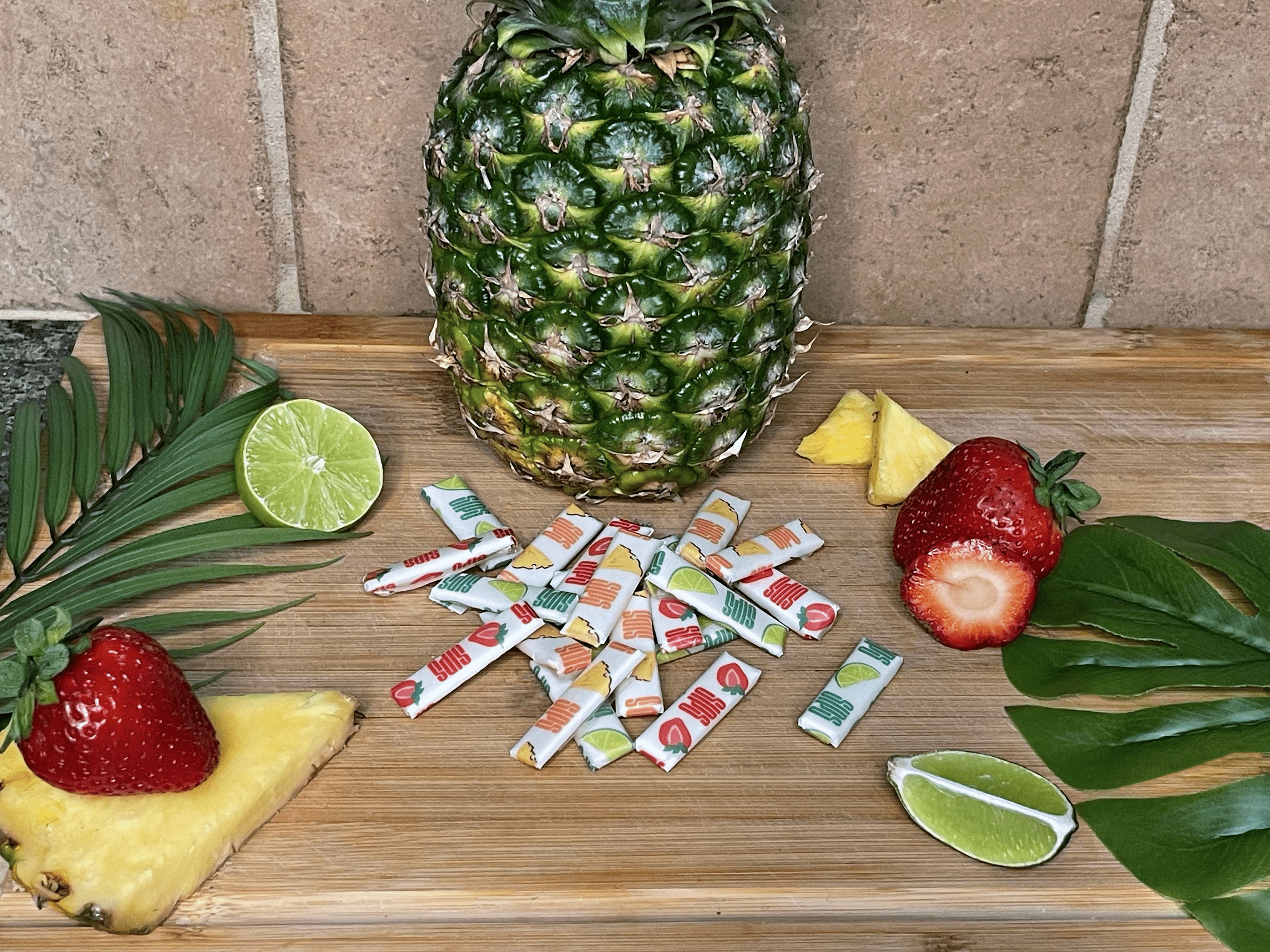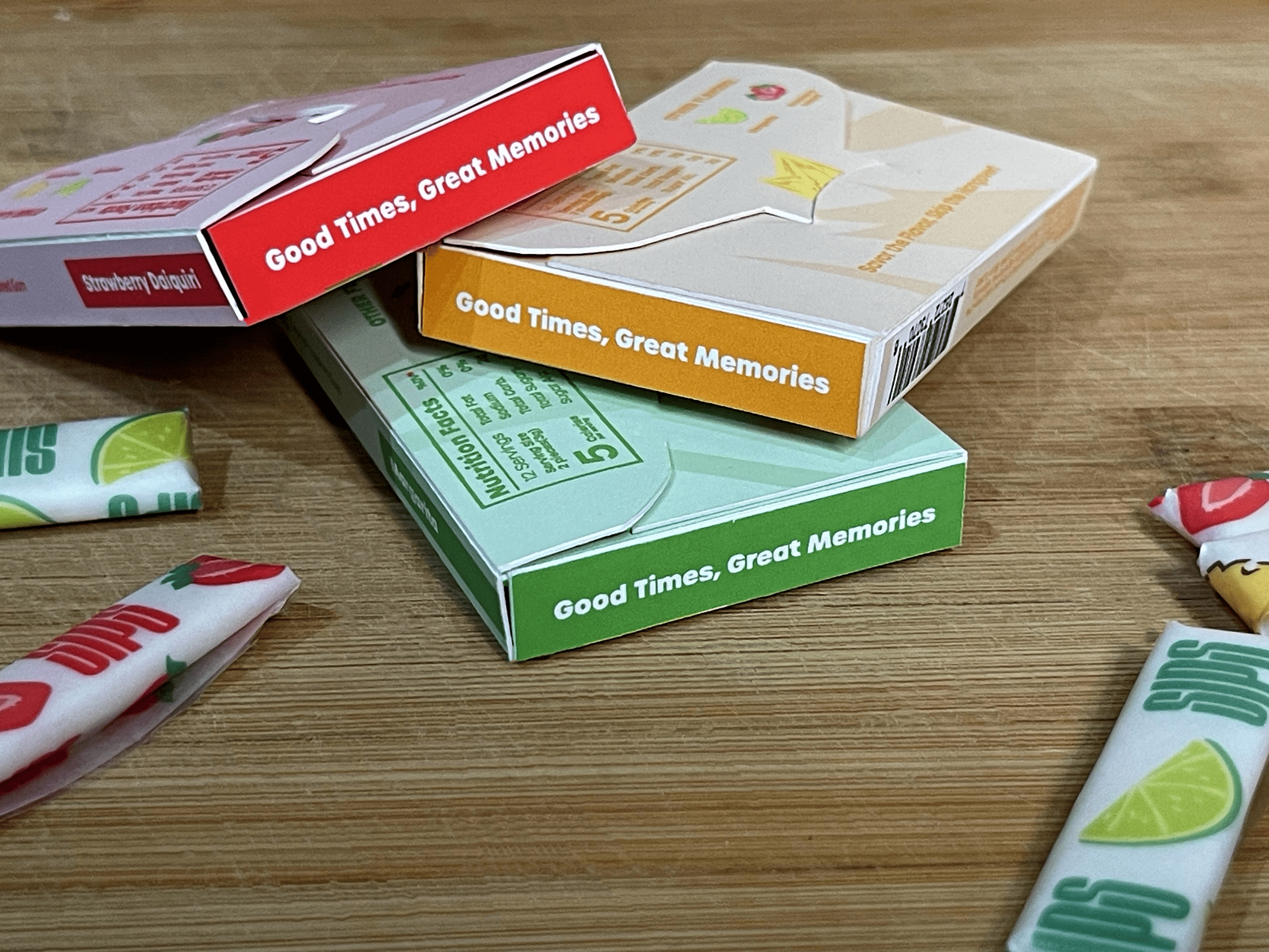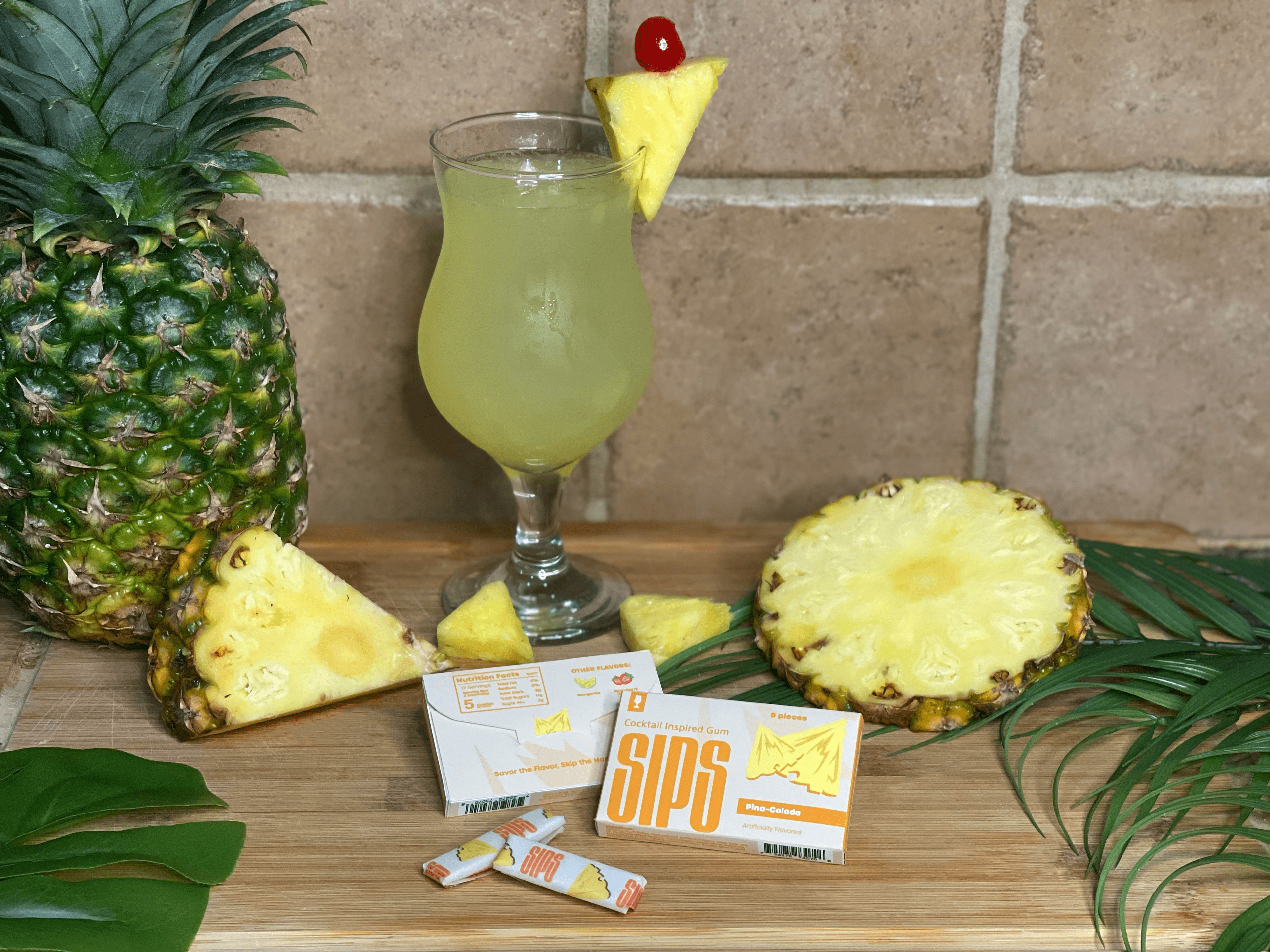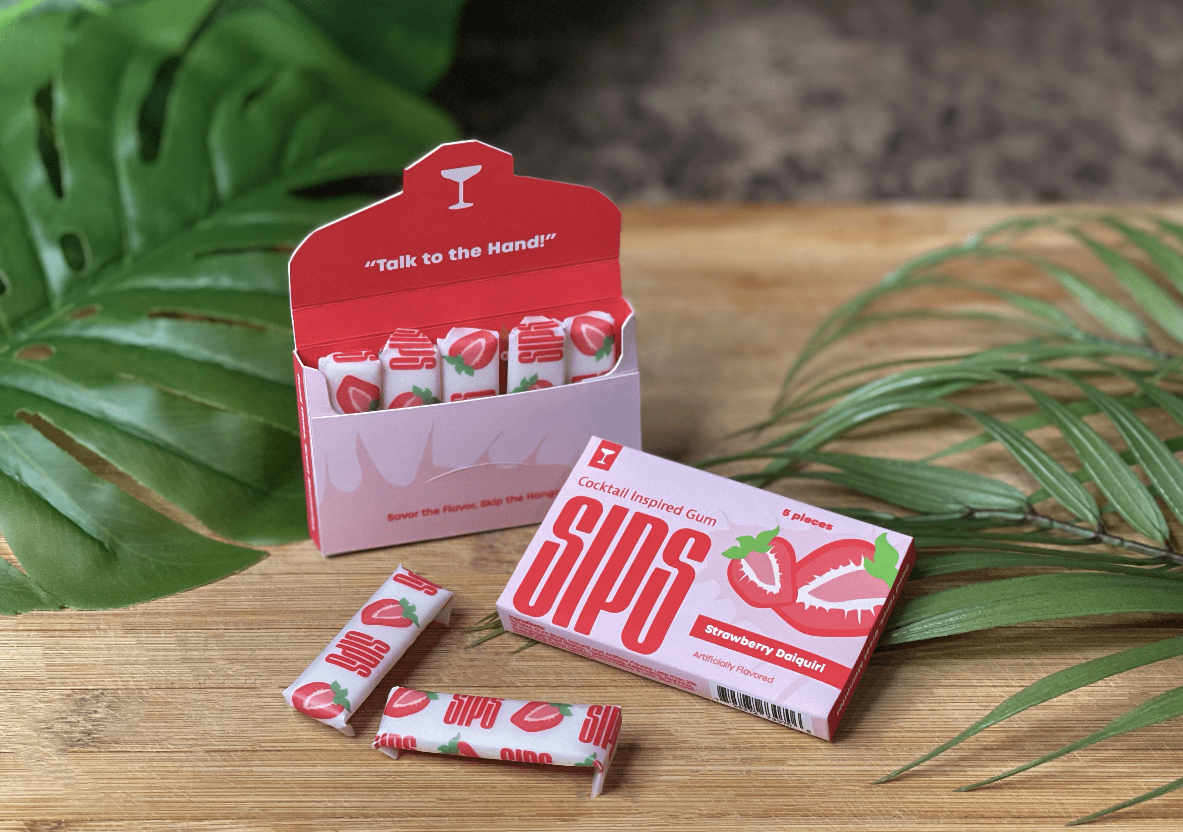 Gum and packaging highlight three virgin mixed drink flavors in chewable form. Inspired by classic cocktails like strawberry daiquiri, margarita, and piƱa~colada, this product offers a refreshing and enjoyable journey.